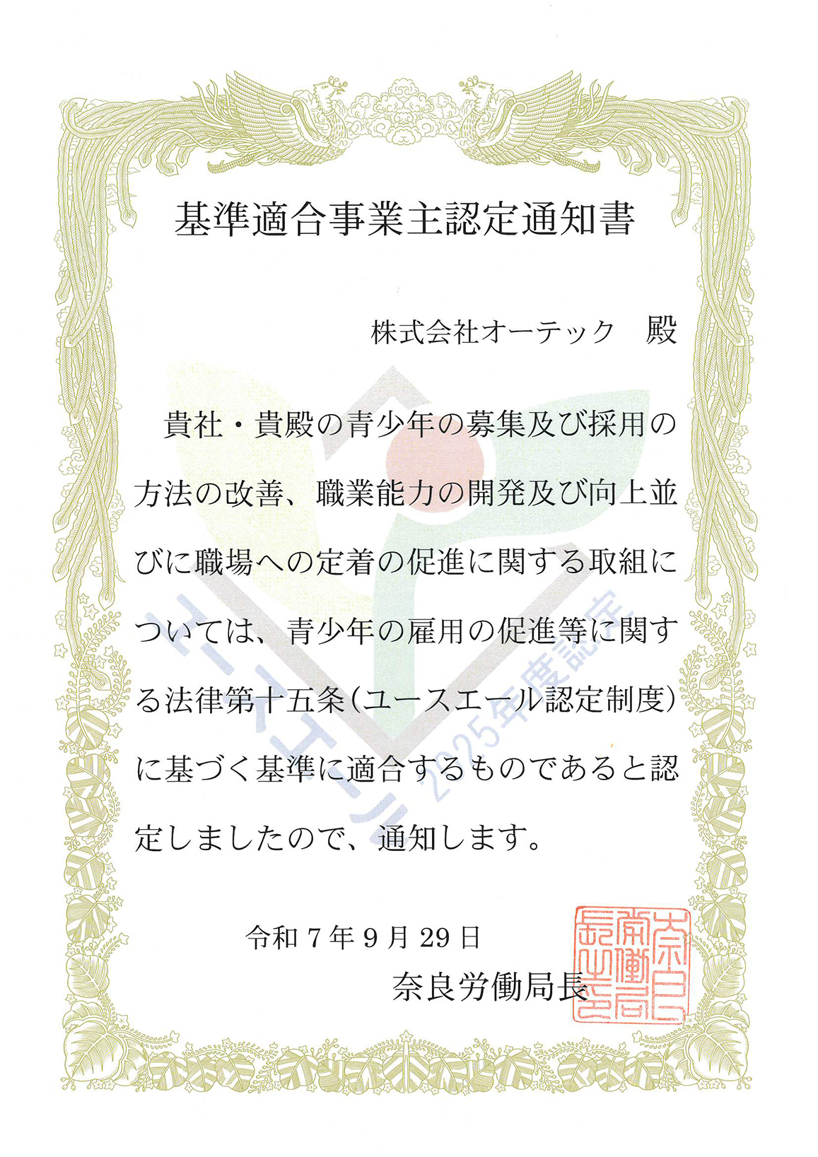 優良な中小企業として、厚生労働大臣より認定されました。