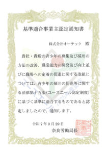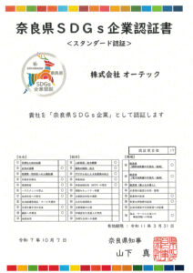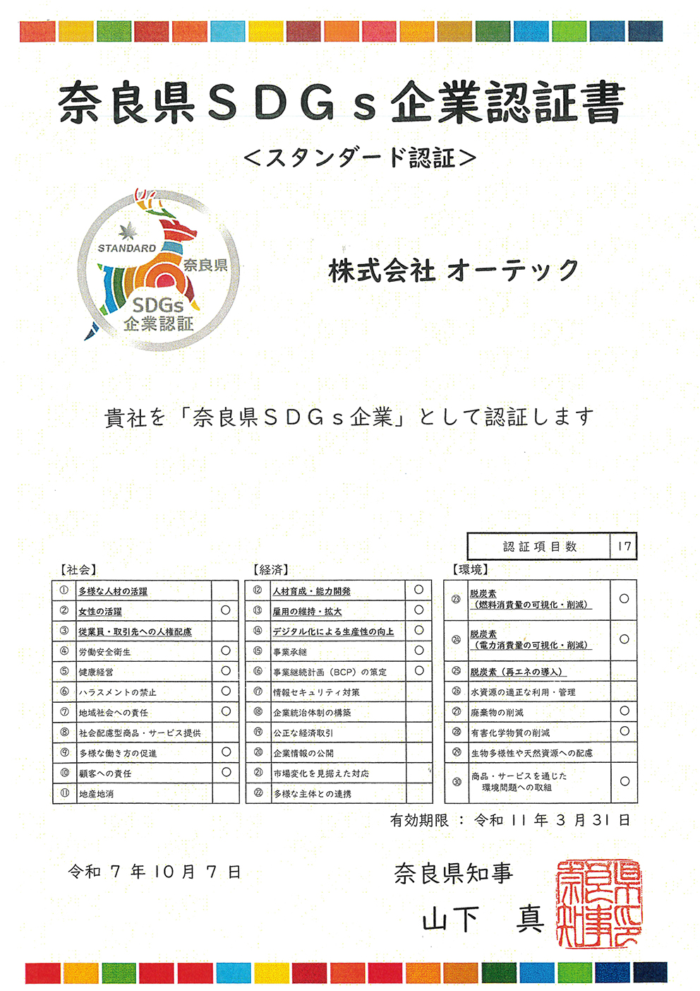 先日、オーテック若者の採用・育成に積極的で、若者の雇用管理の状況などが 優良な中小企業として、厚生労働大臣よりユースエール認定を受けました。 そして、令和7年度(2025年)から「奈良県SDGs企業認証制度」が始まり、 オーテックのSDGsに係る一層の取組に対して評価を受け、認定証を受賞しました。